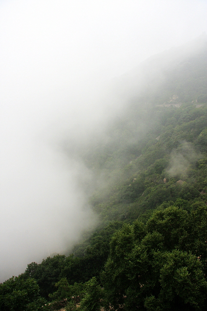 路遇一群年轻的驴友,背着全部辎重,真有干劲儿。跟他们领队学到一个经验——雨雾天,山路湿滑,走土路,不要踩石头,后者滑!
