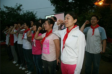 两班学员分别围成圈,快速报数到60,用时短者胜出,共赛5局。输掉一方的班长要受罚,男生俯卧撑,女生仰卧起坐,20个起步;每输一局累加20。结果输掉最后一局的班长要做80个仰卧起坐。队员可以代替,每10个仅按1个计算。规则严肃,不能减免、不许讲情,任凭大家筋疲力尽。