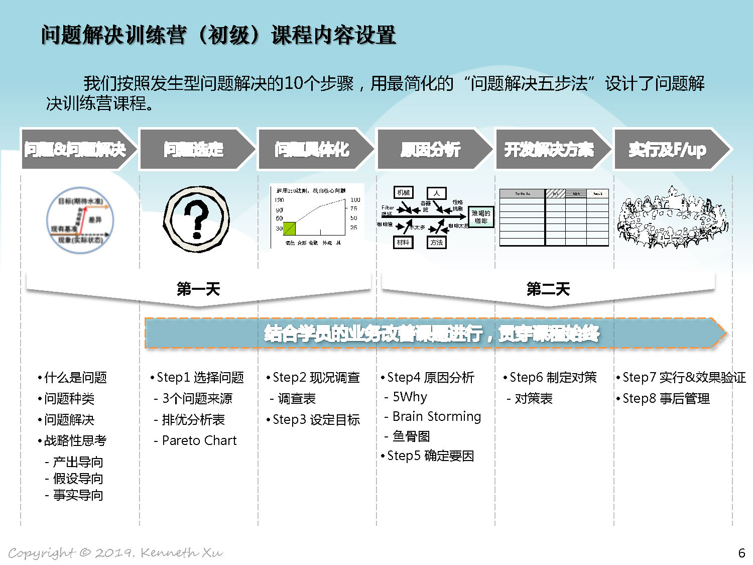 问题分析与解决训练营 课程背景 企业的运营与发展就是一系列解决问题的过程,问题解决的效果将直接决定着企业的效益;解决问题不是单单依靠经验,更不是靠拍脑子、灵光一现来解决,一定需要一套可以复制的方法在组织内部得到良好的运用好推广;对于管理而言,在成功和出色地完成一项工作的过程中,总会遇到或大或小的问题。如果没有掌握工作问题分析与解决的方法,对工作本身是一种阻碍。许多管理者常对以下问题感到困惑: 如何抛开问题表面的迷雾,发现问题的本质? 如何改变原有的惯性思维与冲动型解决问题的习惯? 如何用系统思维分析和解决问题,并用有限的资源高效解决问题? 问题分析与解决能力已经成为职业人员,特别是管理人员必备的基本能力之一; 课程内容 本课程本着开放、主动、理性、系统、流程化的思维来分析问题、制定决策、解决问题 课程特色 极强的改善和创新思维,授人以鱼不如授人以渔,以实战案例、实战演练帮助培训对象掌握问题分析和解决的思维; 系统的思维模式,看到不一定想到,想到不一定做到,做到不一定做成,做成不一定做好,影响结果好坏的环节太多、太复杂,本课程以系统的方法论阐述课程要点,环环相扣; 实用的应用工具,好看不一定好用,好用一定是实用,这些应用工具都是企业在实战中应用并且产生结果。 课程收益 帮助企业人员在工作过程中认清问题、查明原因、寻找对策、落实行动; 厘清分析问题、解决问题的思路; 掌握问题分析的方法和步骤; 掌握问题解决的原则、方法和策略; 提高个人和团队的解决问题技巧,提高团队决策能力; 面对复杂或简单的问题、决策和规划,团队和个人均能开展更快捷有效的工作; 在基于事实的基础上解决所关注的事件并澄清错误信息; 找出情况不佳或表现良好的真实原因,并确定解决方案和改进措施; 通过出色的风险管理来更加有效地实施解决方案及改进措施;